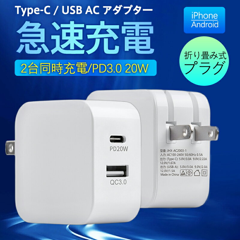 ACアダプター スマホ充電器 PD iPhone QC3.0 USB 急速充電器 20w Type-c 2ポート チャージャー 高速 急速 コンセント