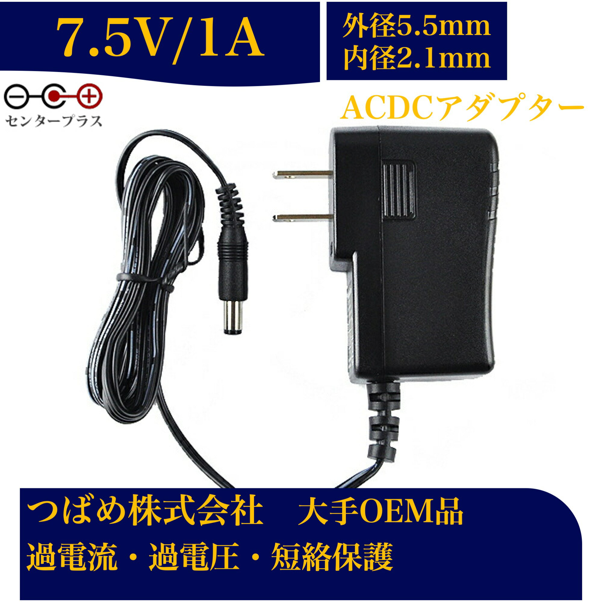 【送料無料】汎用スイッチング式 ACアダプター 7.5V 1A 最大出力7.5W PSE取得品 出力プラグ 外径5.5mm 内径2.1mm 1年保証付 AC100V-240V 1アンペア プラグ コネクタ 電力変換器