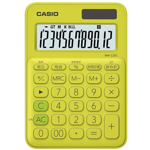 商品名 カラフル電卓(ミニジャストタイプ) 品番 MW-C20C-YG-N カラー ライムグリーン 仕様 特長:卓上でもコンパクトなミニジャストタイプ 消費税の税込・税抜き計算が行える。